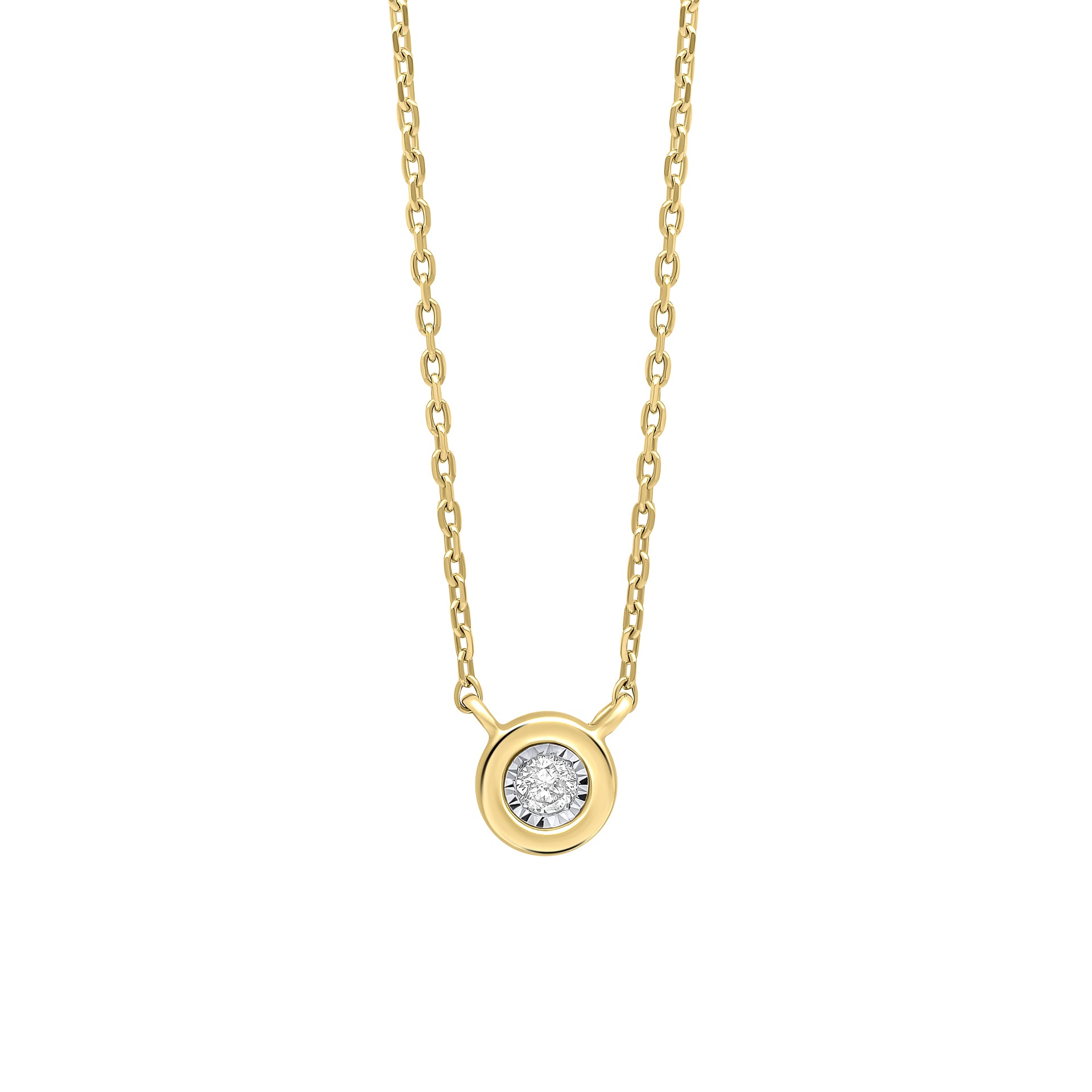 Crafted from luxurious 9ct yellow gold, this exquisite necklace showcases a dazzling bezel-set solitaire diamond that radiates sophistication and understated glamour.
