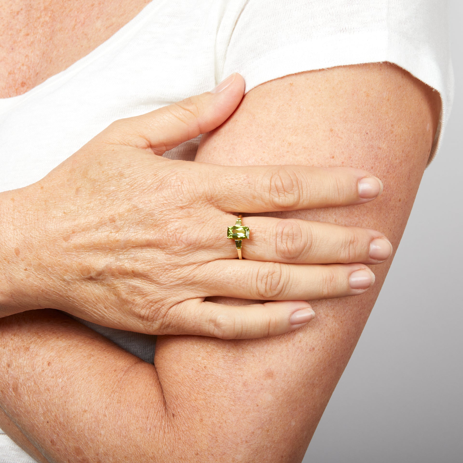 At its centre lies a radiant rectangular peridot, beautifully complemented by two trapezoidal peridot stones on either side.